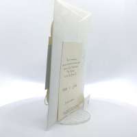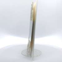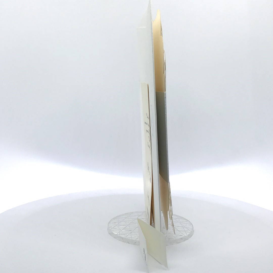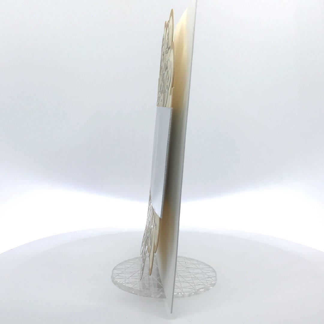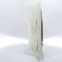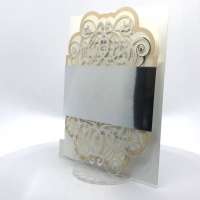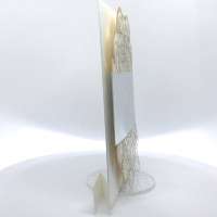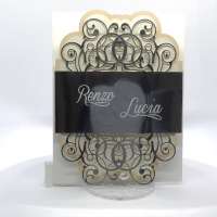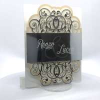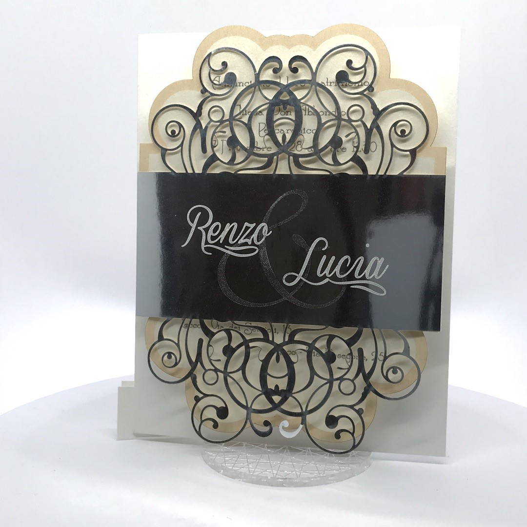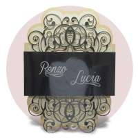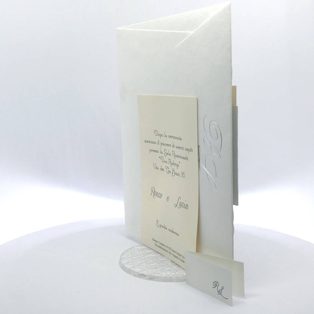 Cartoncino sagomato realizzato su carta perlata e fascetta realizzata su carta specchiata argento con iniziali incise e decori intagliati a laser.