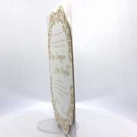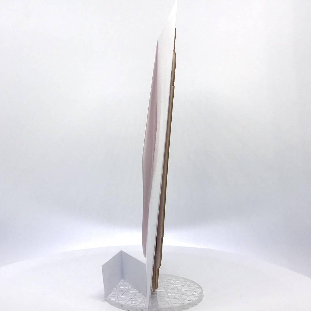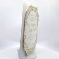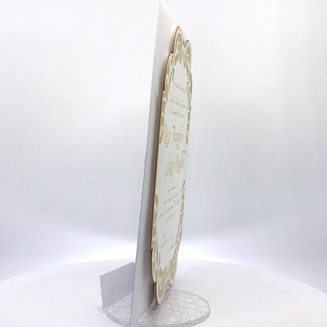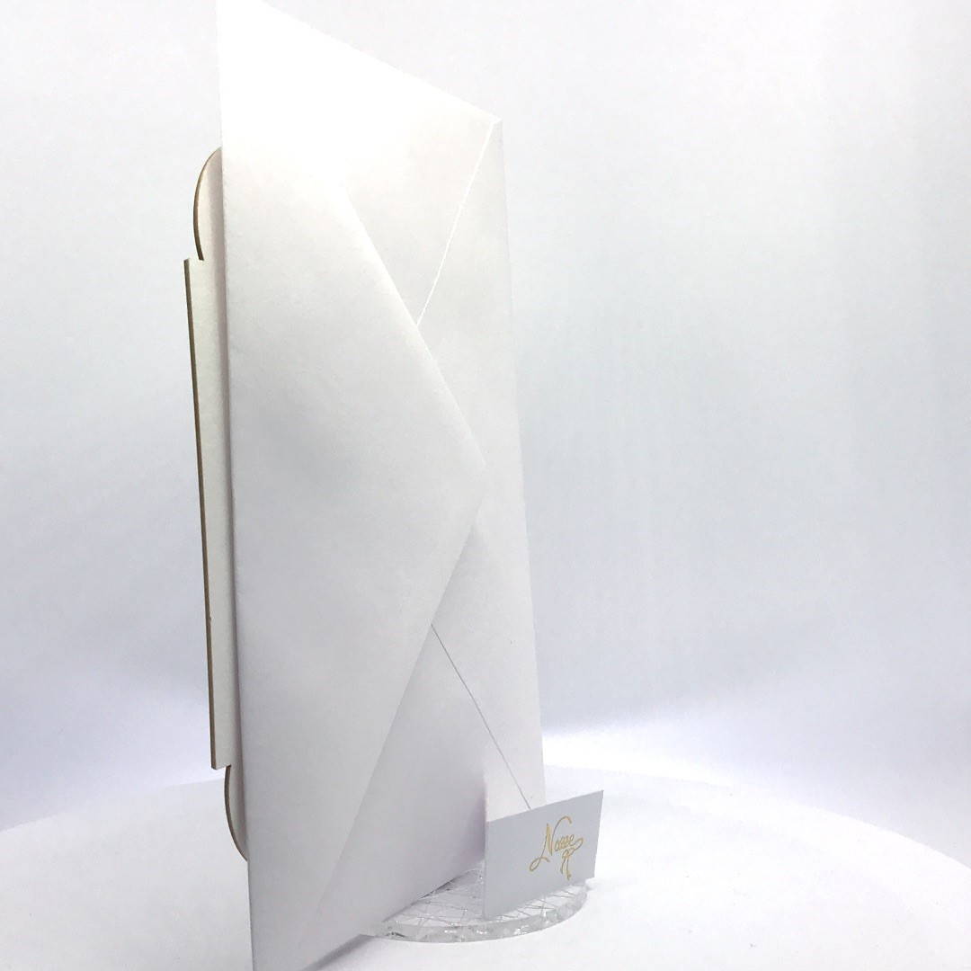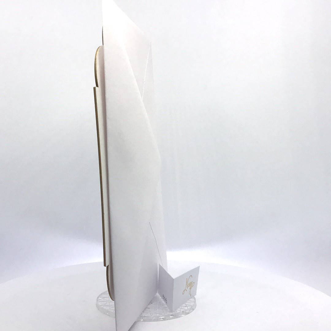Cartoncino sagomato realizzato su carta con grammatura pesante 800 gr, decori e testo incisi a laser.