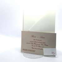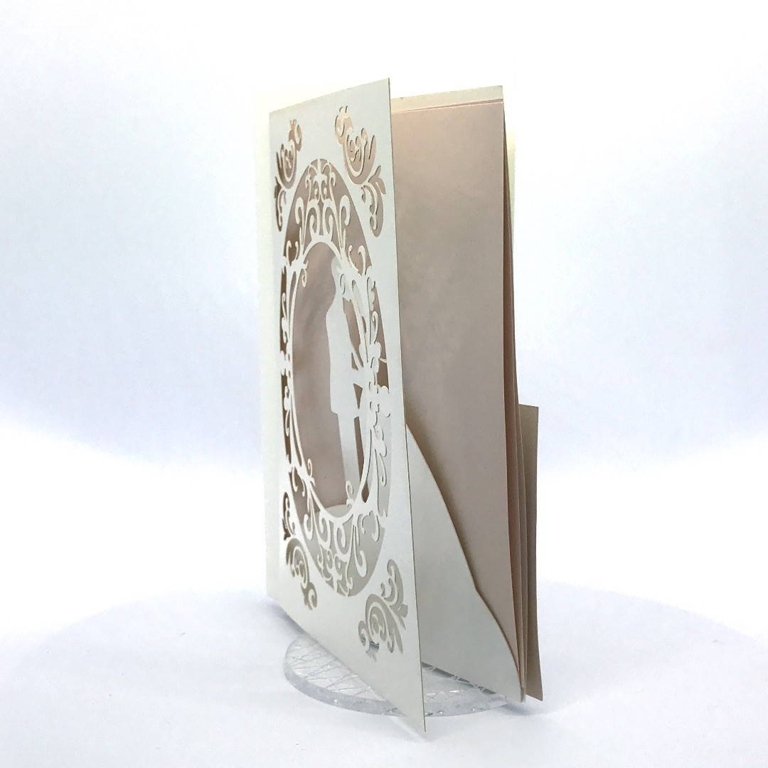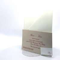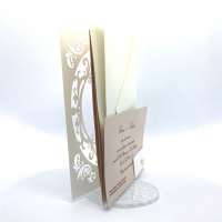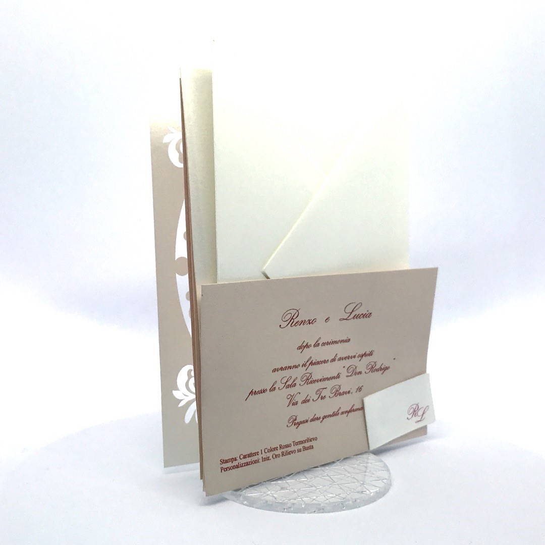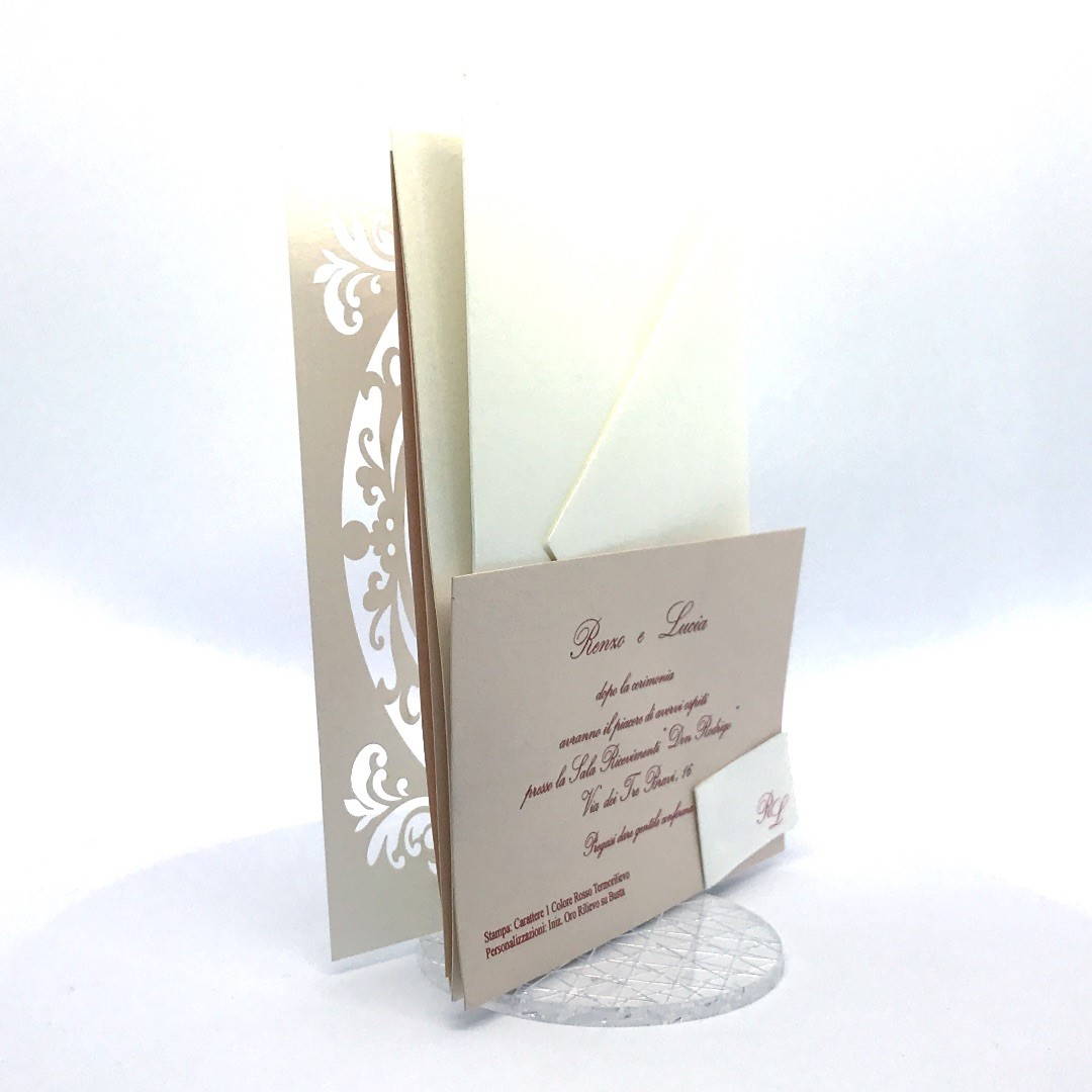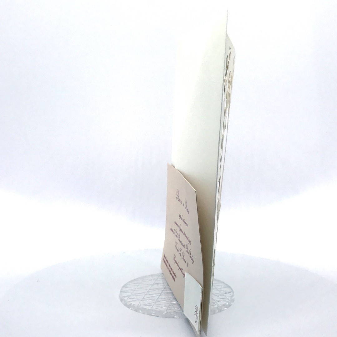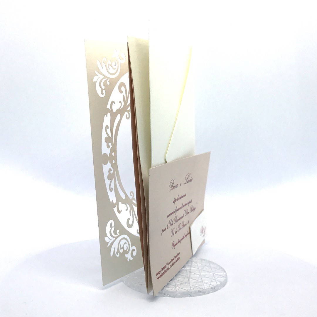 L'esterno è realizzato in carta perlata avorio con sposini intagliati a laser, interno realizzato su carta color biscotto.