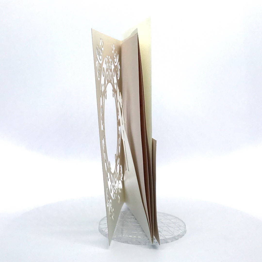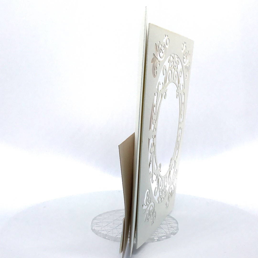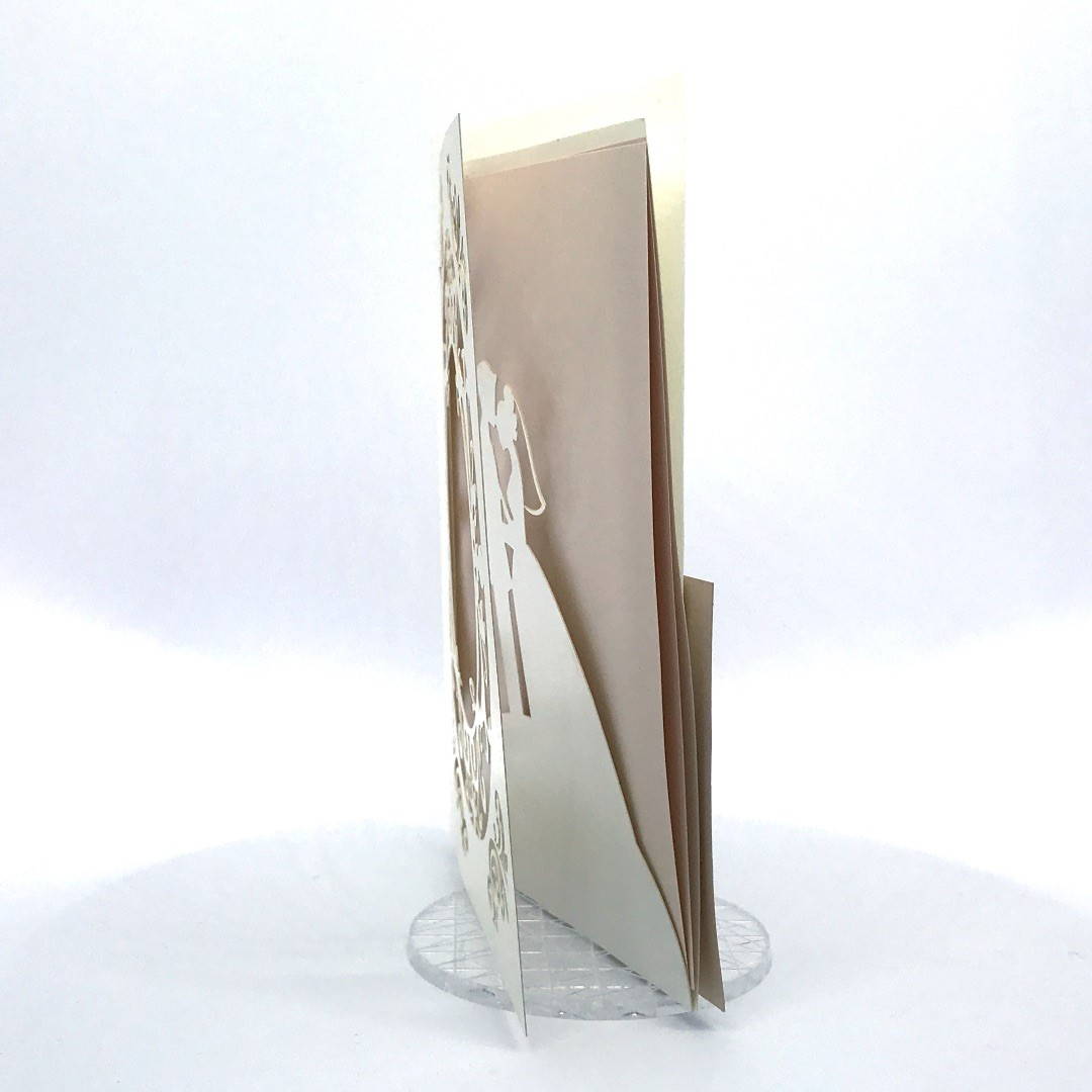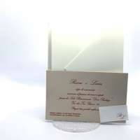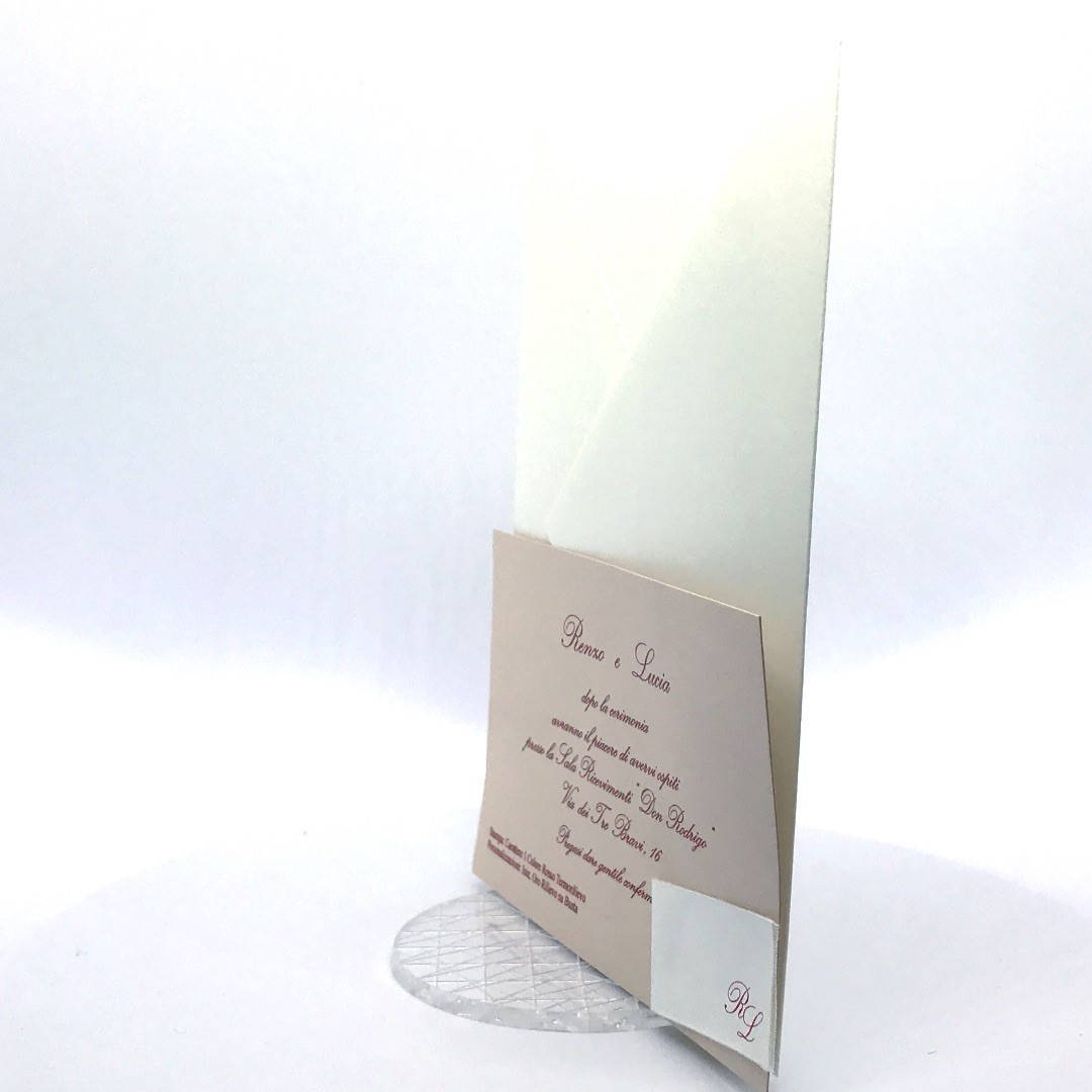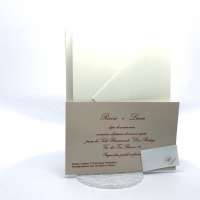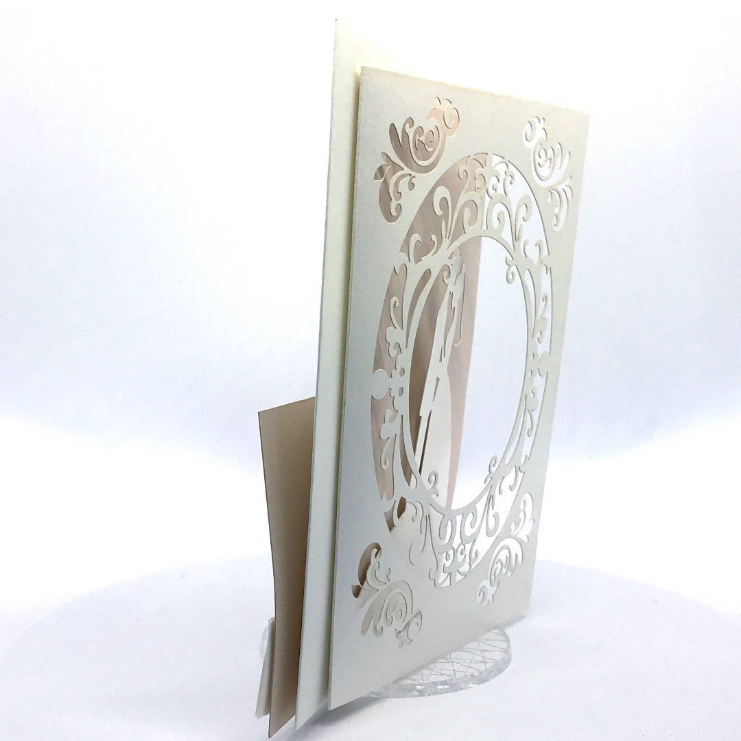 L'esterno è realizzato in carta perlata avorio con sposini intagliati a laser, interno realizzato su carta color biscotto.