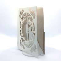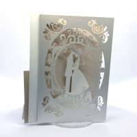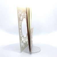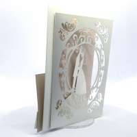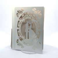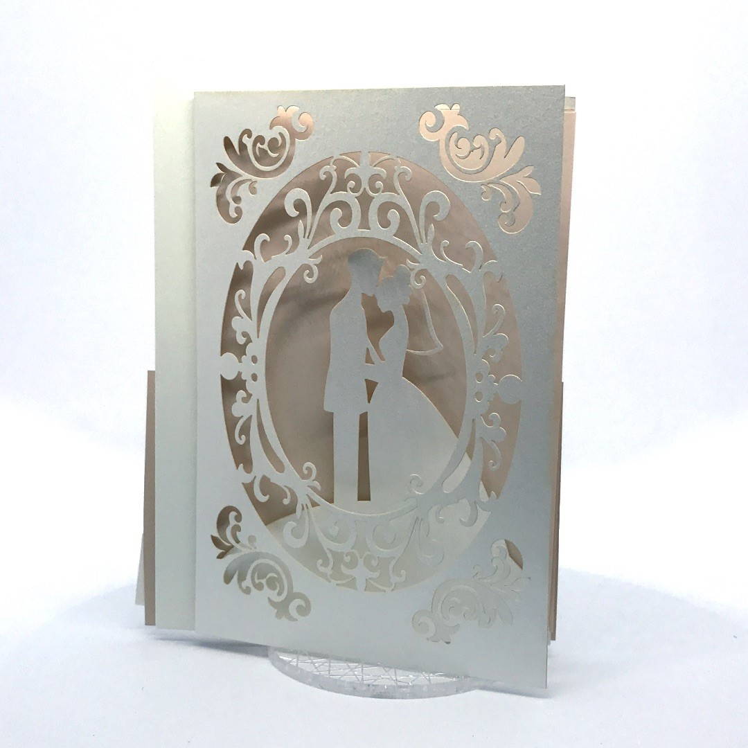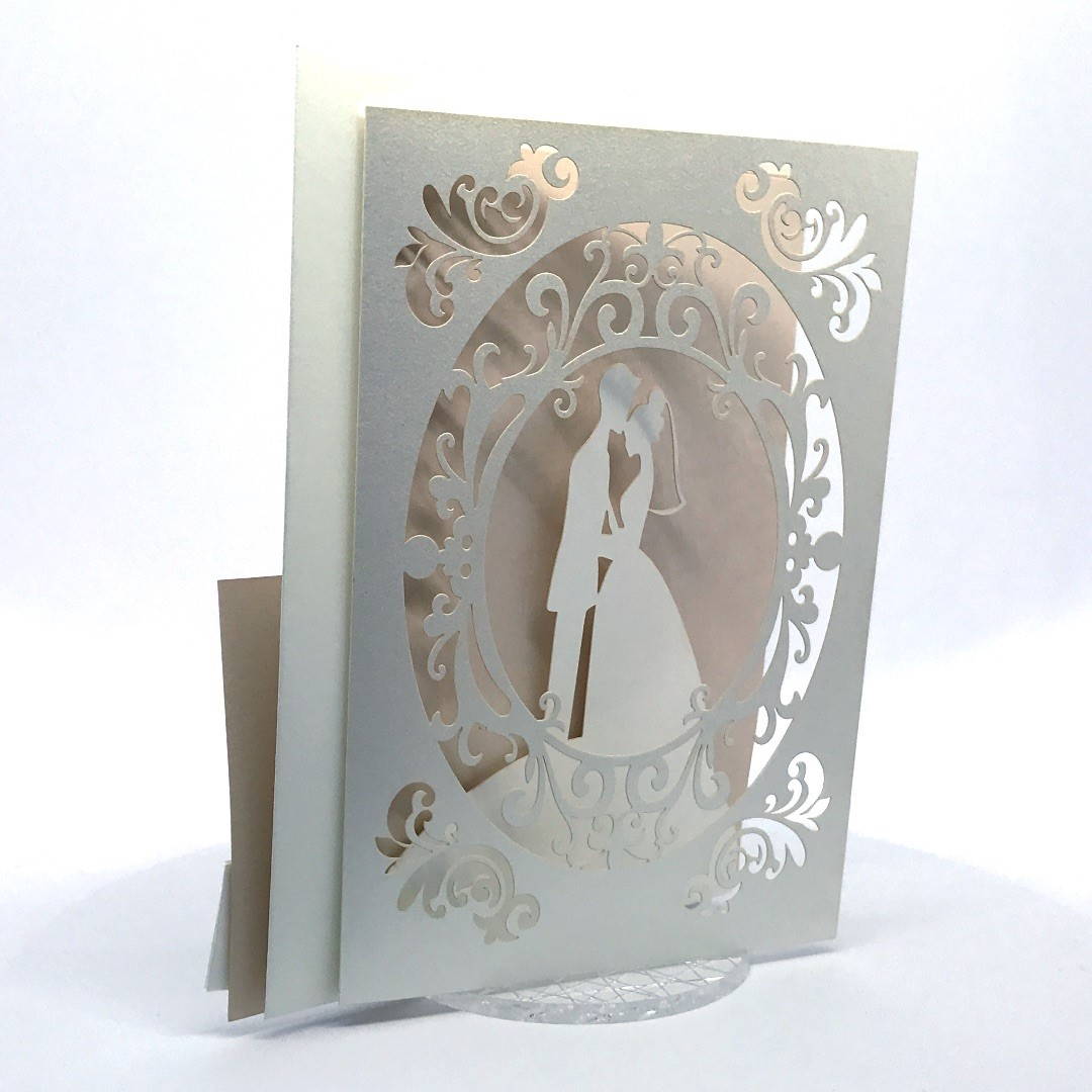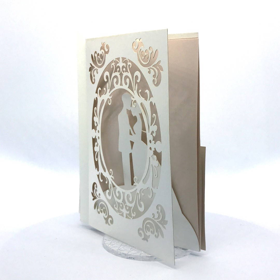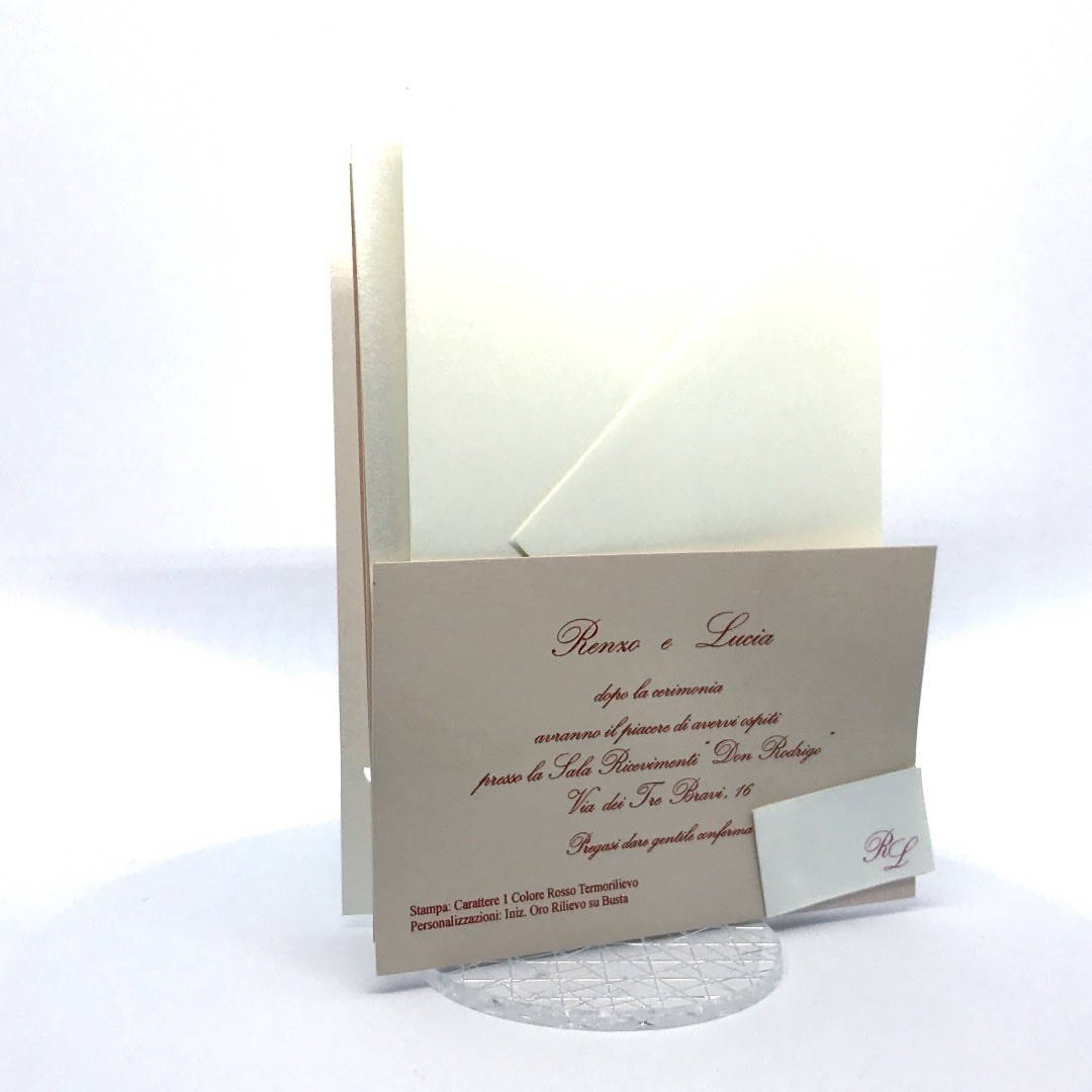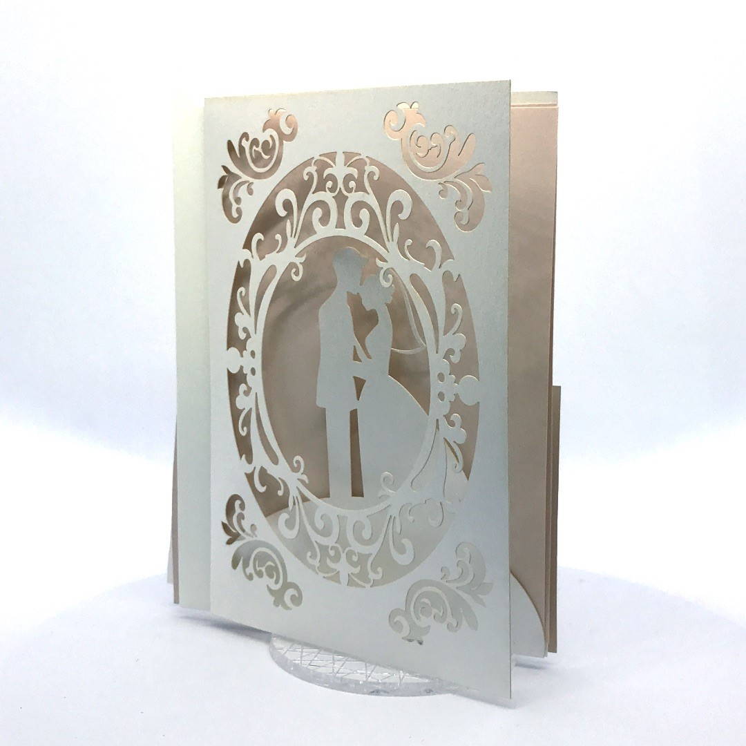 L'esterno è realizzato in carta perlata avorio con sposini intagliati a laser, interno realizzato su carta color biscotto.