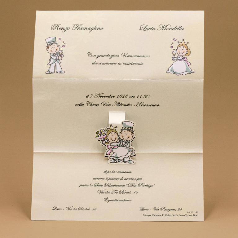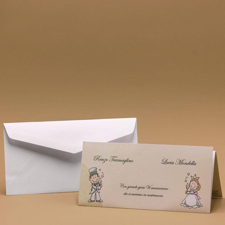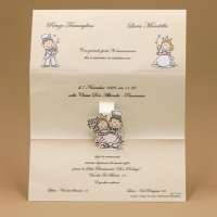 Partecipazioni di nozze pop-up con grafica sposi su foglio piegato a tre, invito abbinato.