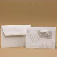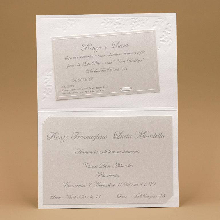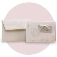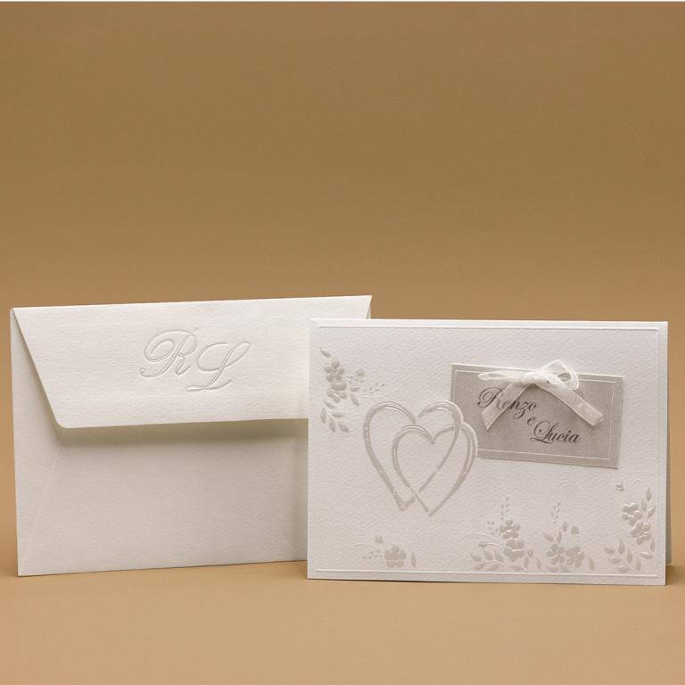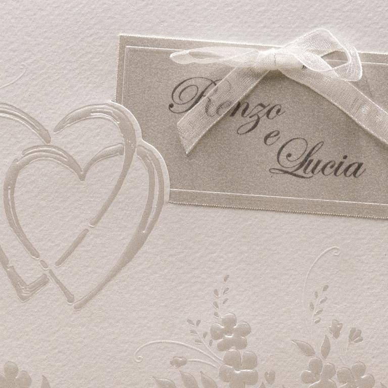 Partecipazione di nozze composta da foglio con apertura verso l'alto, decorato con cuori e motivi floreali a rilievo. All'interno viene inserito nella parte bassa il foglio in carta metallizzata avorio per la partecipazione, nella parte alta viene inserito l'invito che presenta due fori che verranno collegati ad un talloncino esterno con i nomi degli sposi, legato da un nastrino in organza.