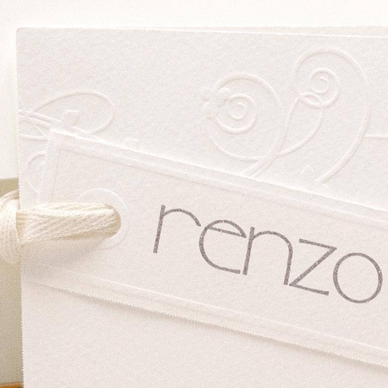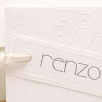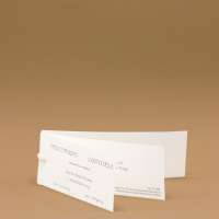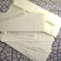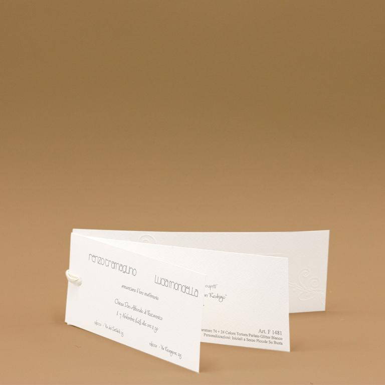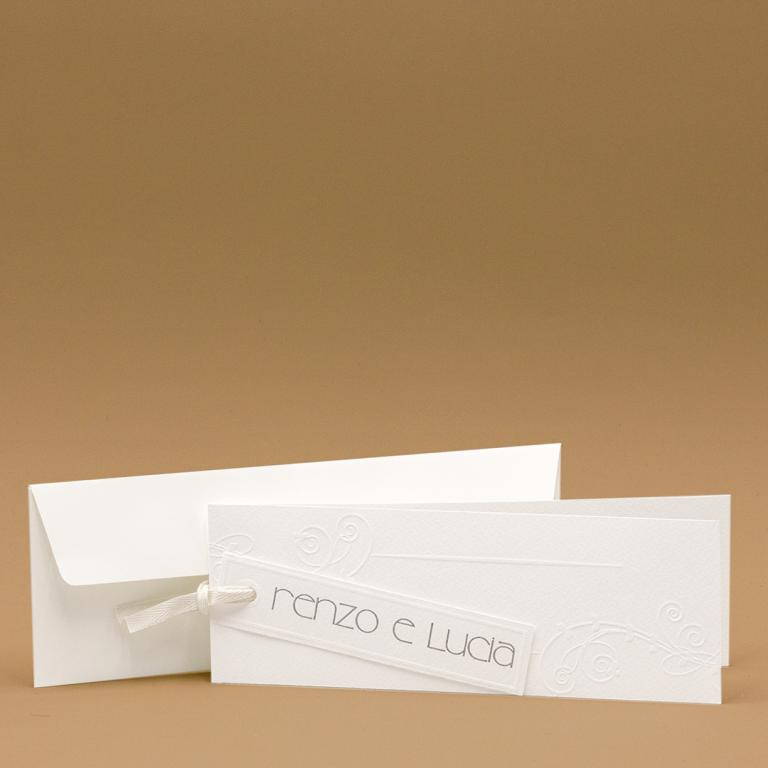 Partecipazione di matrimonio composta da tre cartoncini rettangolari ed un talloncino per i nomi degli sposi, realizzata con carta ruvida avorio, decorata con fiori stilizzati a secco e nastrino avorio.