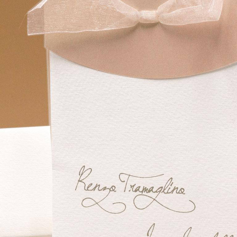Partecipazioni di matrimonio verticale a tre fogli, supporto color rosa legati da nastrino in organza. Invito abbinato.