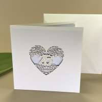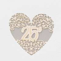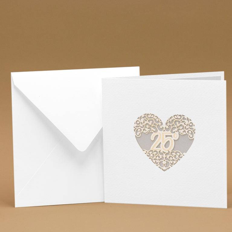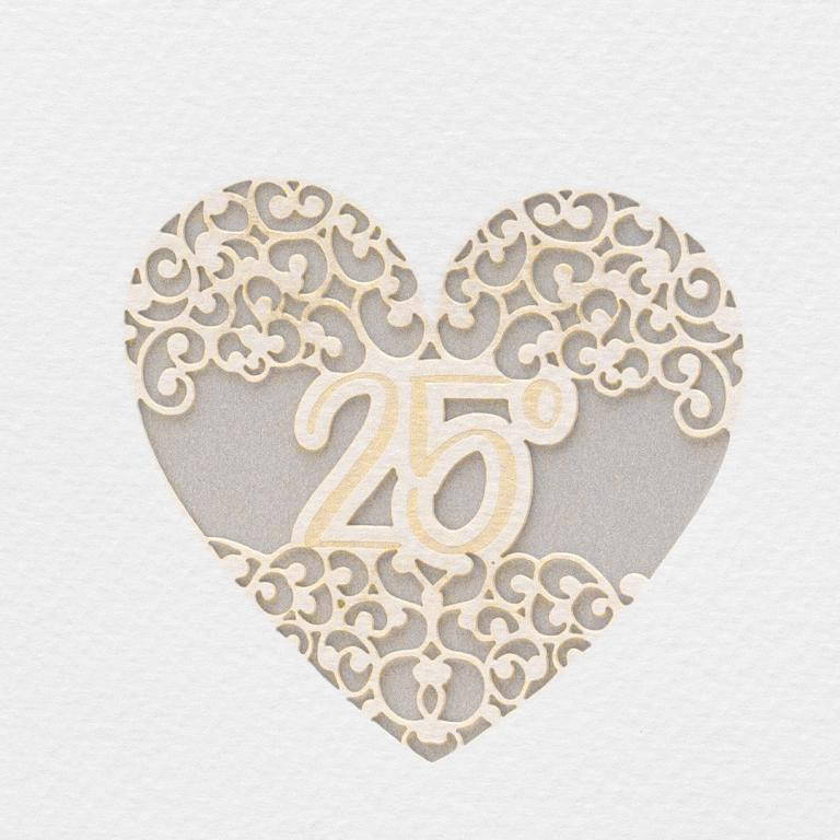 Partecipazione per 25° anniversario di matrimonio, composta da un interno realizzato con carta metallizzata silver e da un esterno realizzato carta martellata panna con taglio laser di un cuore e il numero "25".