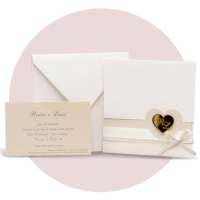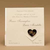 Partecipazione di matrimonio quadrata composta da due tipologie di cartoncini: esterno in carta martellata panna ed interno realizzato su carta perlata avorio con cuore intagliato a laser.