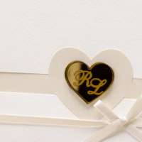 Personalizzazione: cuoricino in plexiglass oro con monogramma degli sposi inciso a laser.