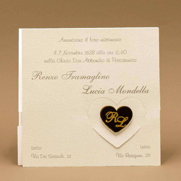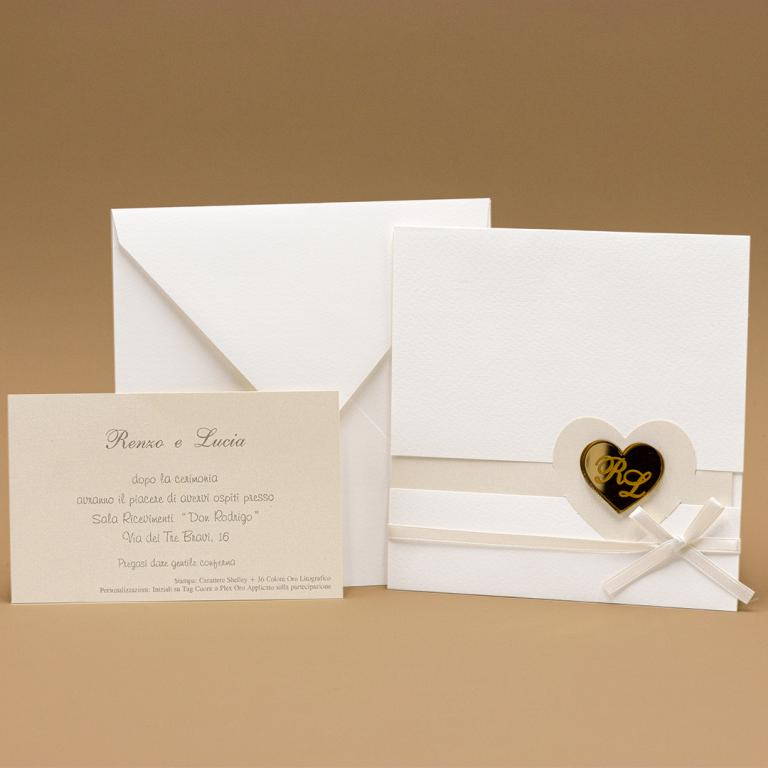 Partecipazione matrimonio con applicazione cuore in plexiglass oro cod. F1632