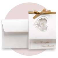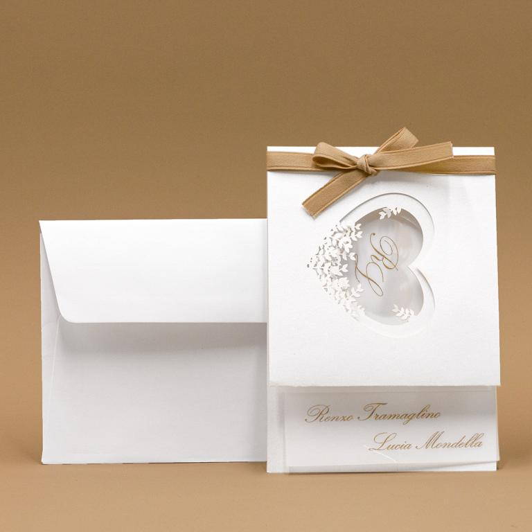 Partecipazione di matrimonio rettangolare, interno realizzato con carta trasparente su cui sono stampate le iniziali degli sposi, il testo dell'annuncio e dell'invito. L'esterno è realizzato su carta perlata bianca con cuore sul fronte intagliato a laser; il tutto è chiuso da un nastro in raso beige.