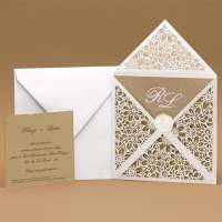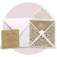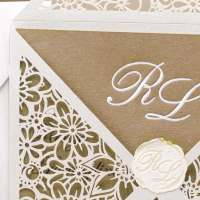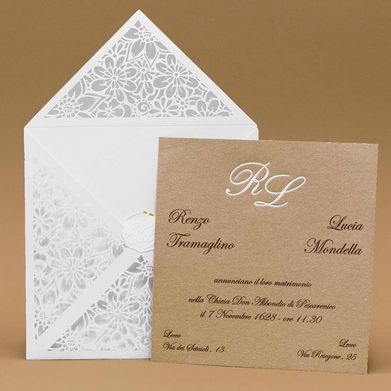 Partecipazione di matrimonio quadrata, composta da una custodia esterna realizzata in carta bianca con fiori intagliati a laser, interno in carta materica kraft su cui è stampato il testo della partecipazione. E' possibile aggiungere alla partecipazione un bollino adesivo tipo ceralacca colorato e personalizzato con le iniziali degli sposi.