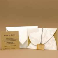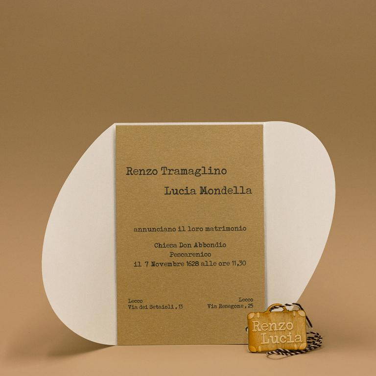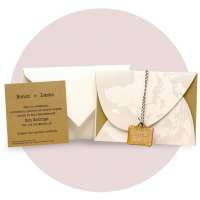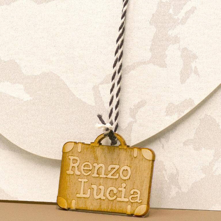 Partecipazione di matrimonio a tema viaggio, composta da un esterno in carta perlata avorio e incisione laser di un planisfero, interno in carta materica kraft su cui è stampato il testo della partecipazione. All'esterno è presente un tag in legno forma valigetta con nomi degli sposi incisi a laser. Invito abbinato.