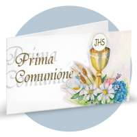 Bigliettini bomboniera in cartoncino bianco prefustellati in f.to A4, immagine su fronte a colori che rappresenta un calice, spighe ed uva, ideale per prima comunione. Minimo d'ordine 20 pz, ordinabili in multipli di 20 pz.