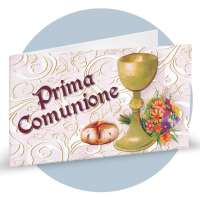 Bigliettini bomboniera in carta bianca liscia prefustellati in f.to A4, immagine su fronte a colori che rappresenta un calice e pane su sfondo rosato, ideale per prima comunione. Minimo d'ordine 20 pz, ordinabili in multipli di 20 pz.