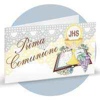 Bigliettini di bomboniera in cartoncino bianco prefustellati in f.to A4, stampa su fronte a colori di dei simboli della comunione (calice, eucarestia, uva e bibbia), ideale per prima comunione. Minimo d'ordine 20 pz, ordinabili in multipli di 20 pz.