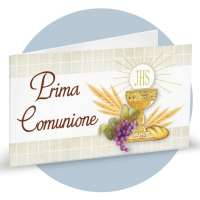 Bigliettini di bomboniera in cartoncino bianco prefustellati in f.to A4, stampa su fronte a colori di dei simboli della comunione (calice, eucarestia, uva, spiga e pane), ideale per prima comunione. Minimo d'ordine 20 pz, ordinabili in multipli di 20 pz.
