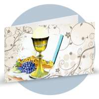 Bigliettini bomboniera in carta bianca liscia prefustellati in f.to A4, immagine su fronte a colori che rappresenta un calice, uva e libro sacro, ideale per prima comunione. Minimo d'ordine 20 pz, ordinabili in multipli di 20 pz.