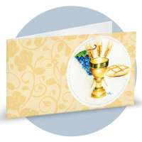 Bigliettini di bomboniera in cartoncino bianco prefustellati in f.to A4, stampa su fronte a colori di dei simboli della comunione (calice, uva, spiga e pane) su sfondo color giallino, ideale per prima comunione. Minimo d'ordine 20 pz, ordinabili in multipli di 20 pz.