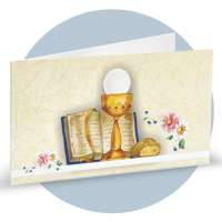 Bigliettini bomboniera in cartoncino bianco prefustellati in f.to A4, immagine su fronte a colori che rappresenta i simboli della comunione (libro sacro, pane, calice ed eucarestia), ideale per prima comunione. Minimo d'ordine 20 pz, ordinabili in multipli di 20 pz.