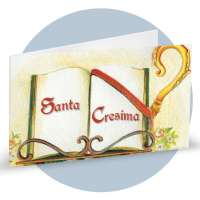 Bigliettini bomboniera in carta bianca prefustellati in f.to A4, immagine su fronte a colori che rappresenta i simboli della cresima (bastone pastorale e bibbia), ideale per cresima. Minimo d'ordine 20 pz, ordinabili in multipli di 20 pz.