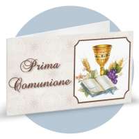 Bigliettini di bomboniera in carta bianca prefustellati in f.to A4, stampa su fronte a colori dei simboli della comunione (calice, bibbia, uva e spiga), ideale per prima comunione. Minimo d'ordine 20 pz, ordinabili in multipli di 20 pz.