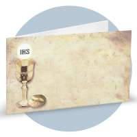 Bigliettini bomboniera in cartoncino bianco prefustellati in f.to A4, immagine su fronte a colori che rappresenta un calice con eucarestia e pane su uno sfondo color ocra stile antico, ideale per prima comunione. Minimo d'ordine 20 pz, ordinabili in multipli di 20 pz.