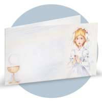 Bigliettini di bomboniera in cartoncino bianco prefustellati in f.to A4, stampa su fronte a colori di un calice e bimba in preghiera, ideale per prima comunione femminuccia. Minimo d'ordine 20 pz, ordinabili in multipli di 20 pz.