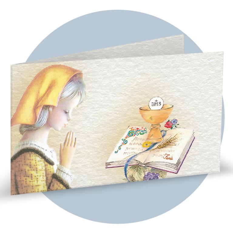 Bigliettino Bomboniere Prima Comunione con immagine mani ed eucarestia cod. BFF0026