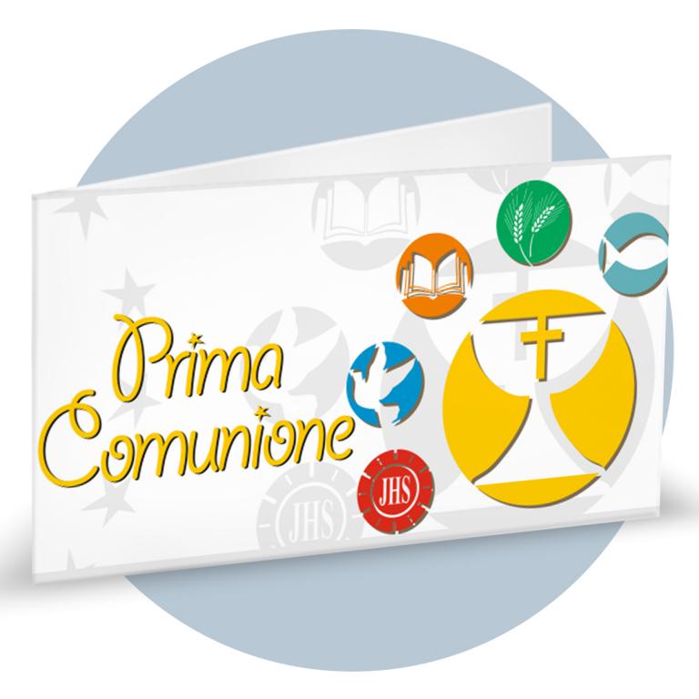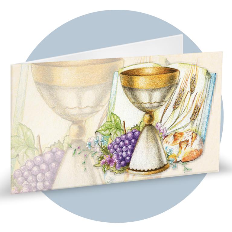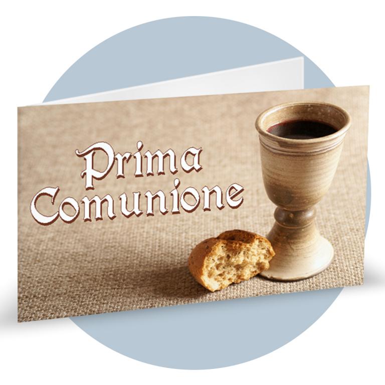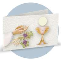 Bigliettini bomboniera in carta martellata panna prefustellati in f.to A4, immagine su fronte a colori che rappresenta delle mani con l'eucarestia, calice ed uva, ideale per prima comunione. Minimo d'ordine 20 pz, ordinabili in multipli di 20 pz.
