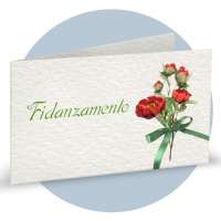 Bigliettino Bomboniera per il fidanzamento prefustellato in formato A4, in cartoncino martellato panna e grafica con fiori rossi e scritta "Fidanzamento" in verde.