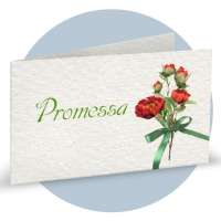 Bigliettino Bomboniera per la promessa prefustellato in formato A4, in cartoncino martellato panna e grafica con fiori rossi e scritta "Promessa" in verde.