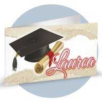 Bigliettino Bomboniera Laurea in carta bianca liscia e stampa di un cappello e pergamena arrotolata con scritta "Laurea" su uno sfondo bianco ed effetto sabbia.