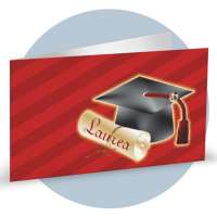 Bigliettino Bomboniera Laurea in carta bianca liscia e stampa di un cappello e pergamena arrotolata con scritta "Laurea" su uno sfondo a righe oblique rosso.