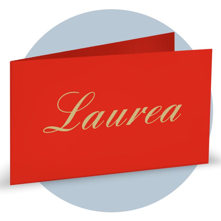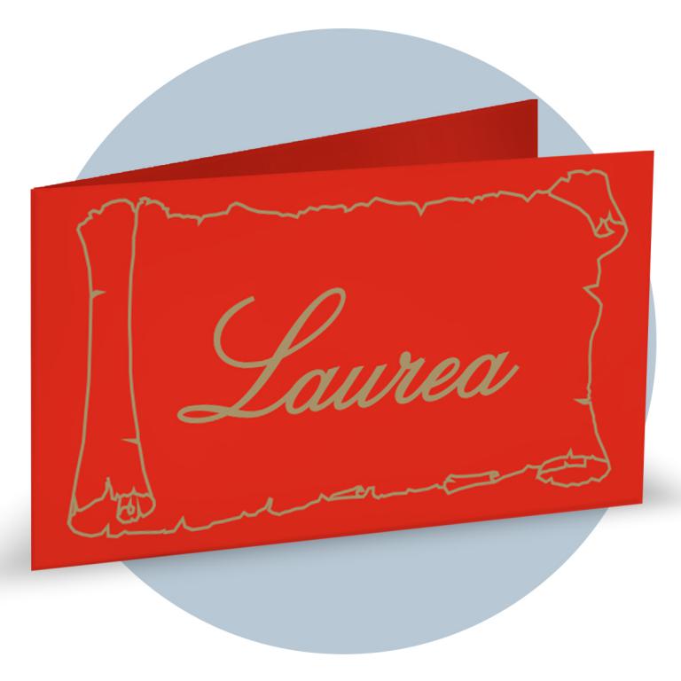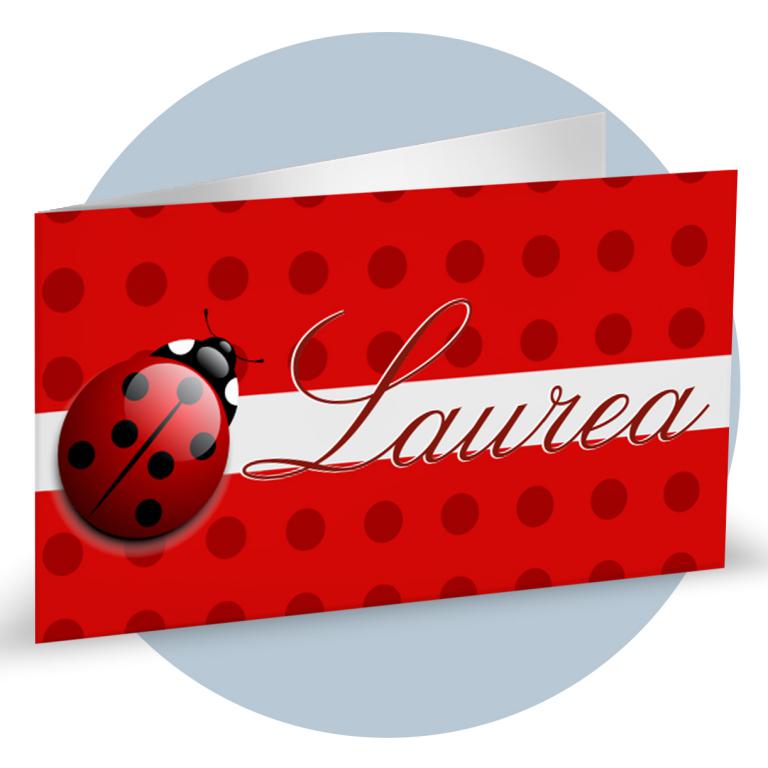Bigliettino Bomboniera Laurea in carta bianca liscia, stampa fondo rosso a pois, coccinella e scritta "Laurea".