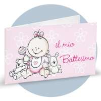 Bigliettini di bomboniera in cartoncino bianco prefustellati in f.to A4, stampa su fronte a colori di una bimba che gioca su sfondo rosa con fiorellini, ideale per battesimo femminuccia. Minimo d'ordine 20 pz, ordinabili in multipli di 20 pz