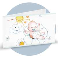 Bigliettini di bomboniera in cartoncino bianco prefustellati in f.to A4, stampa su fronte a colori di un bimbo steso su una margherita, ideale per nascita maschietto. Minimo d'ordine 20 pz, ordinabili in multipli di 20 pz.