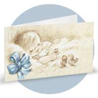 Bigliettini di bomboniera in cartoncino bianco prefustellati in f.to A4, stampa su fronte a colori di un bimbo che dorme con fiocchetto celeste, ideale per nascita o battesimo maschietto. Minimo d'ordine 20 pz, ordinabili in multipli di 20 pz.