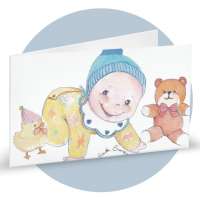 Bigliettini di bomboniera in cartoncino bianco prefustellati in f.to A4, stampa su fronte a colori di un bimbo con cappello, ideale per nascita maschietto. Minimo d'ordine 20 pz, ordinabili in multipli di 20 pz.