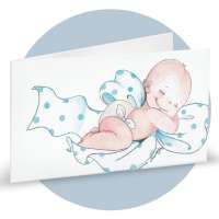 Bigliettini di bomboniera in cartoncino bianco prefustellati in f.to A4, stampa su fronte a colori di un bimbo che dorme su un fiocco a pois celeste, ideale per nascita maschietto. Minimo d'ordine 20 pz, ordinabili in multipli di 20 pz