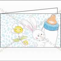 Bigliettini di bomboniera in cartoncino bianco prefustellati in f.to A4, stampa su fronte a colori di un coniglietto con biberon su sfondo celeste, ideale per nascita maschietto. Minimo d'ordine 20 pz, ordinabili in multipli di 20 pz.