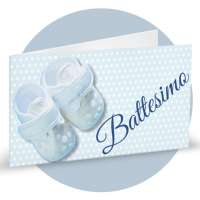 Bigliettini di bomboniera in cartoncino bianco prefustellati in f.to A4, stampa su fronte a colori di scarpette e scritta "Battesimo" in blu su sfondo celeste, ideale per nascita maschietto. Minimo d'ordine 20 pz, ordinabili in multipli di 20 pz.