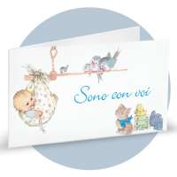 Bigliettini di bomboniera in cartoncino bianco prefustellati in f.to A4, stampa su fronte a colori di un bimbo in fasce con uccellini, gattino, paperella e orsacchiotto, ideale per nascita maschietto. Minimo d'ordine 20 pz, ordinabili in multipli di 20 pz.