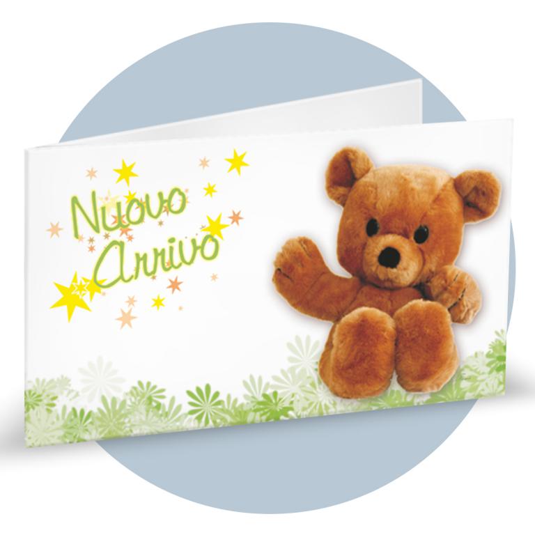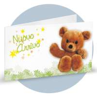 Bigliettini di bomboniera in cartoncino bianco prefustellati in f.to A4, stampa su fronte a colori di un orsacchiotto, ideale per nascita generico. Minimo d'ordine 20 pz, ordinabili in multipli di 20 pz,
