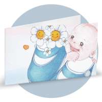 Bigliettini di bomboniera in cartoncino bianco prefustellati in f.to A4, stampa su fronte a colori di una bimbo che si nasconde dietro le scarpette azzurre, ideale per nascita maschietto. Minimo d'ordine 20 pz, ordinabili in multipli di 20 pz.
