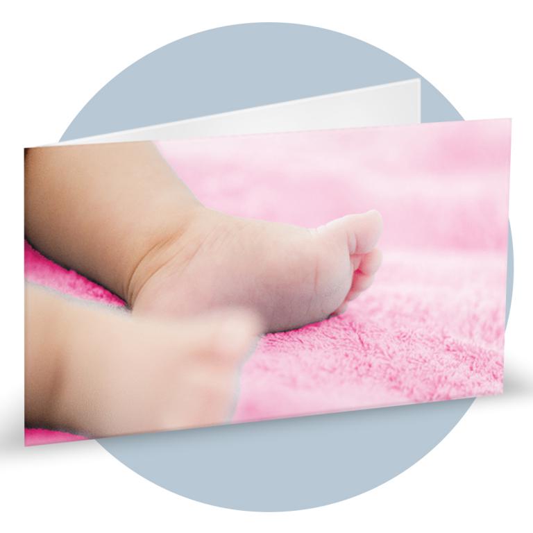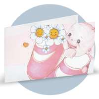 Bigliettini di bomboniera in cartoncino bianco prefustellati in f.to A4, stampa su fronte a colori di una bimba che si nasconde dietro le scarpette rosa, ideale per nascita femminuccia. Minimo d'ordine 20 pz, ordinabili in multipli di 20 pz.