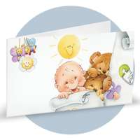 Bigliettini di bomboniera in cartoncino bianco prefustellati in f.to A4, stampa su fronte a colori di bimbo che gioca con orsacchiotti, ideale per nascita generico. Minimo d'ordine 20 pz, ordinabili in multipli di 20 pz.