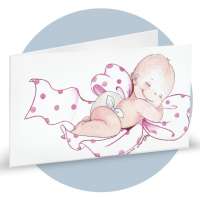 Bigliettini di bomboniera in cartoncino bianco prefustellati in f.to A4, stampa su fronte a colori di una bimba che dorme su un fiocco a pois rosa, ideale per nascita femminuccia. Minimo d'ordine 20 pz, ordinabili in multipli di 20 pz.