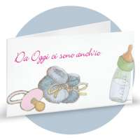 Bigliettini di bomboniera in cartoncino bianco prefustellati in f.to A4, stampa su fronte a colori di biberon, ciuccio e scarpette, ideale per nascita femminuccia. Minimo d'ordine 20 pz, ordinabili in multipli di 20 pz.