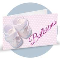 Bigliettini di bomboniera in cartoncino bianco prefustellati in f.to A4, stampa su fronte a colori di scarpette e scritta "Battesimo" in fucsia su sfondo rosa, ideale per nascita maschietto. Minimo d'ordine 20 pz, ordinabili in multipli di 20 pz.