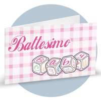 Bigliettini di bomboniera in cartoncino bianco prefustellati in f.to A4, stampa su fronte a colori di uno sfondo quadrettato rosa e dadi, ideale per battesimo femminuccia. Minimo d'ordine 20 pz, ordinabili in multipli di 20 pz.